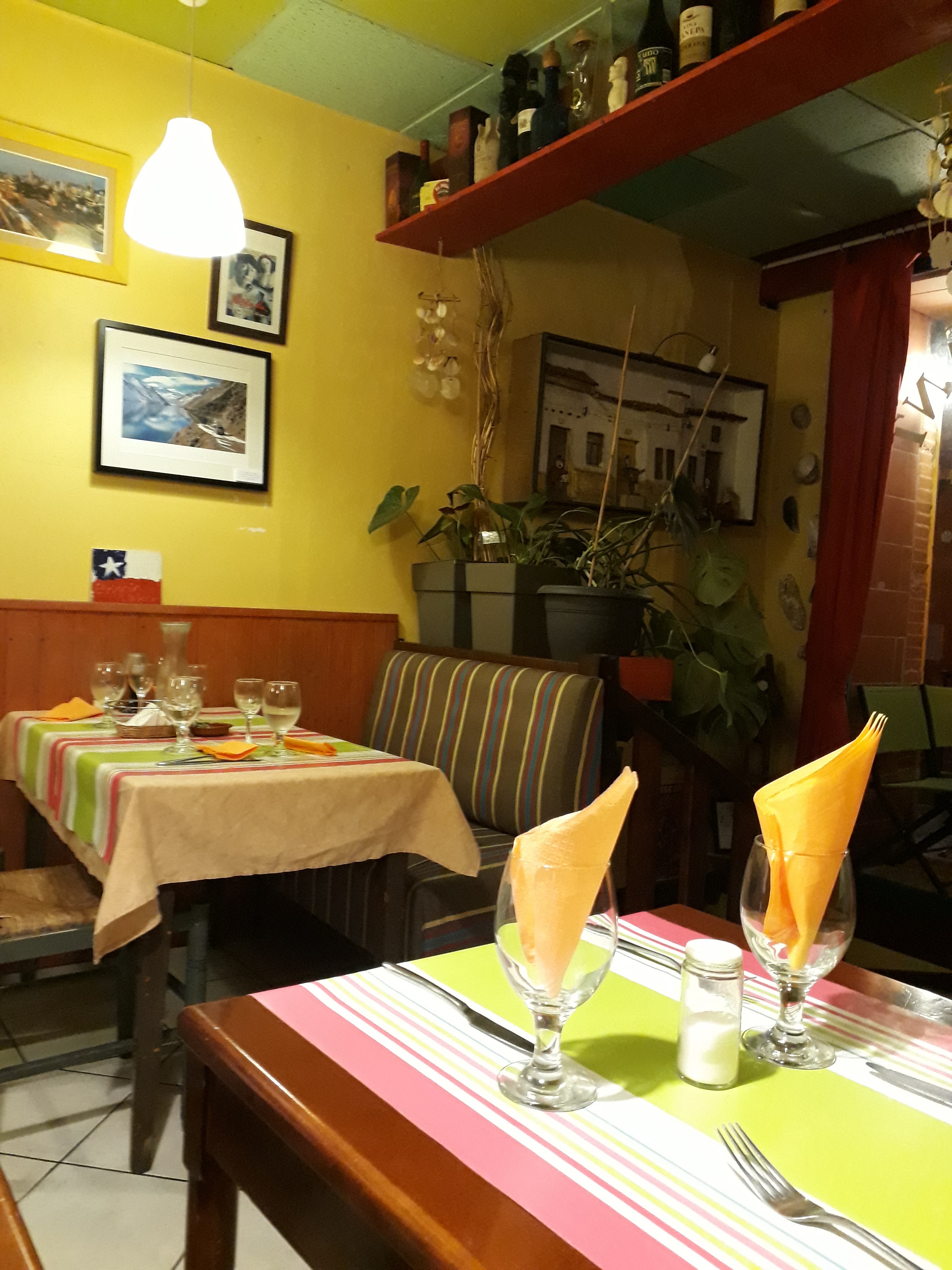 Petit restau qui a une salle aussi au sous sol, l'ambiance est très bon enfant, la jeune serveuse a l'accent de là bas, le patron est un bonhomme simple et agréable. Bref on se sent comme chez soi et ce n'est pas bruyant. La musique donne envie de se remuer, mais elle n'est pas omniprésente et reste en fond musical. Coté cuisine nous avons pris le menu chili con carne: salade variée à l'assaisonnement équilibré en entrée, chili avec une préparation que je ne connaissais pas en accompagnement (piment, coriandre, huile d'olive...) à mettre sur le chili comme on a envie. En dessert mangue avec crème chantilly très correct. C'est probablement de la mangue au sirop, mais quel gout! vraiment sympa, c'est rare. Pour accompagner le tout: un vin chilien. Rien à critiquer. Un petit restau pour un dîner tranquille et original avec des spécialités chiliennes que l'on sent comme vraiment maison.